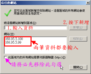 3. 請輸入 168.95.5.99 後,按下「新增」;再輸入 168.95.5.100 ,並按下「新增」,接著按下「關閉」完成第一步設定。(不要勾選此區域內的所有網站需要伺服器驗證)。