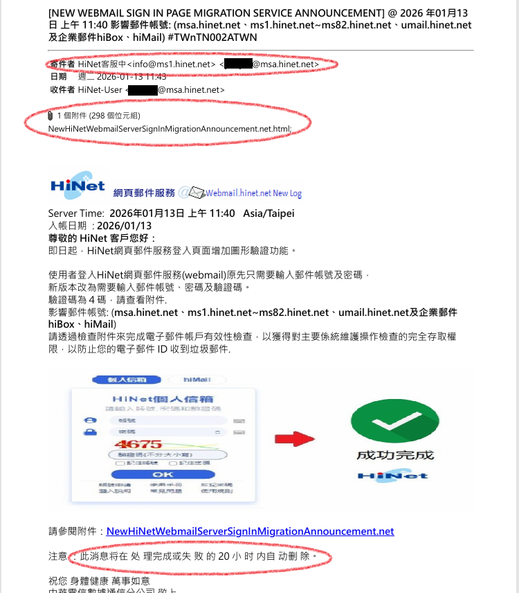 這封釣魚信件用詞與正常HiNet的通知信件相似,但仍有2個重點可以分辦